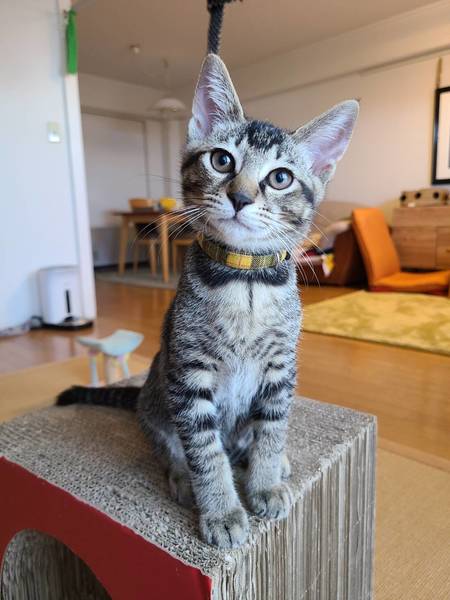 | 特徴(性格など) | 2021.4.7生まれ(推定) 毛色:キジトラ キジトラですが、背中に縞がなくアビシニアン風です! お腹には縞あり! やんちゃ坊主でちょっぴりビビり。 兄妹のなかで一番の甘えん坊で膝の上に乗ってきて、 ゴロゴロ言いながら寝てしまいます♡ 甘えん坊全開のフクゾウをどうぞよろしく♪ |