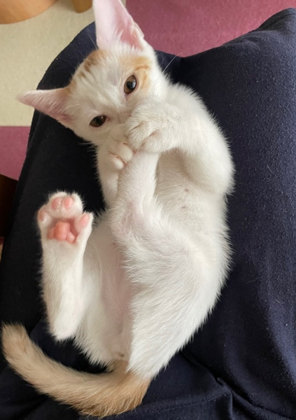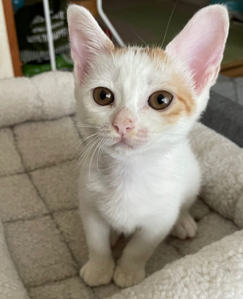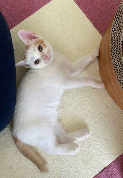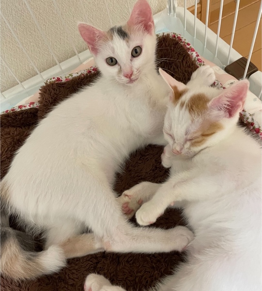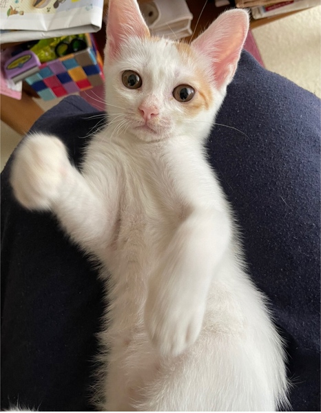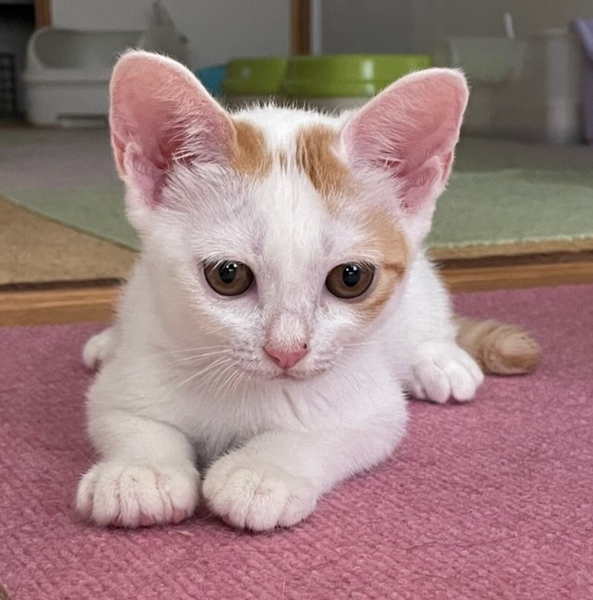 | 特徴(性格など) | ほぼ白色の毛ですが所々に茶色の毛のある特徴的な子です。 眠くなるとに人の横に来て寝てししまうのんびり屋さんの愛嬌のある顔立ちです。 |
