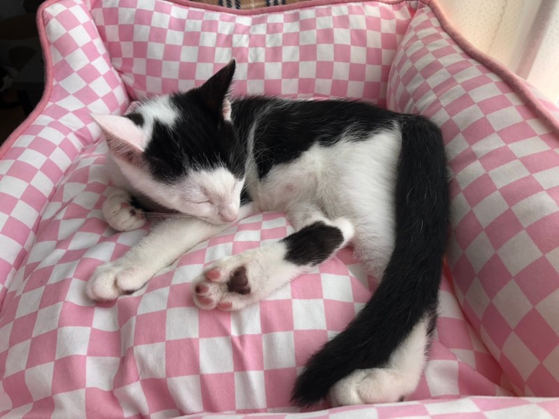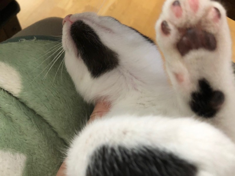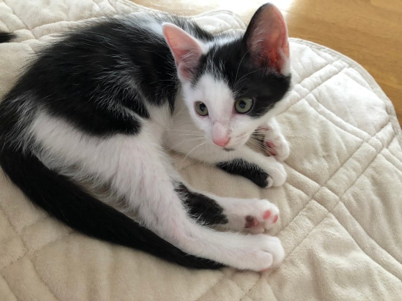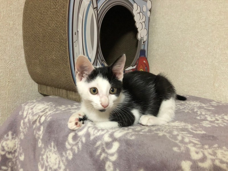 | 特徴(性格など) | 2021.4.13生まれ 毛色:白黒 つぶらな瞳とアシンメトリーな前髪模様が可愛らしい白黒男の子。 アゴヒゲ模様を下から見るとまるでおにぎりみたいで美味しそう♫ 男の子の中ではほっそり小さめボディ。 好奇心旺盛で遊ぶのが大好きなのですが、兄妹達がいる場所では ちょっぴり遠慮しちゃうタイプ。 みんながオモチャに夢中になっていると、こっそり人のお膝を独占しちゃう 甘えん坊さんで、ず~っと抱っこさせてくれますよ♡ ナデナデが大好きなので顔周りを撫でてあげるとウットリ目を細めて そのままZZZしちゃう癒し系です☆ |
