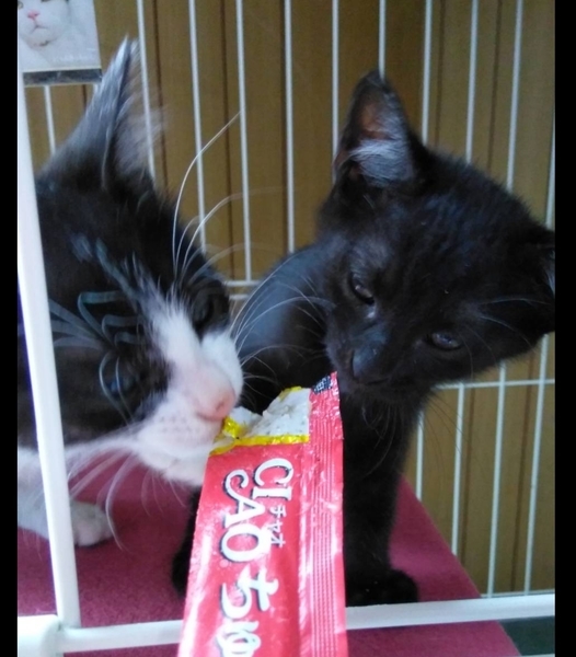 | 特徴(性格など) | 黒猫と白黒ハチワレの兄弟仔猫です。 よく食べよく寝てよく遊び、先住猫からの指導も受けながらスクスク育っています。 野良猫でしたが、人間にも慣れてきました。 病院で簡易な健康診断、ノミ・ダニ駆除レボリューション済。 |