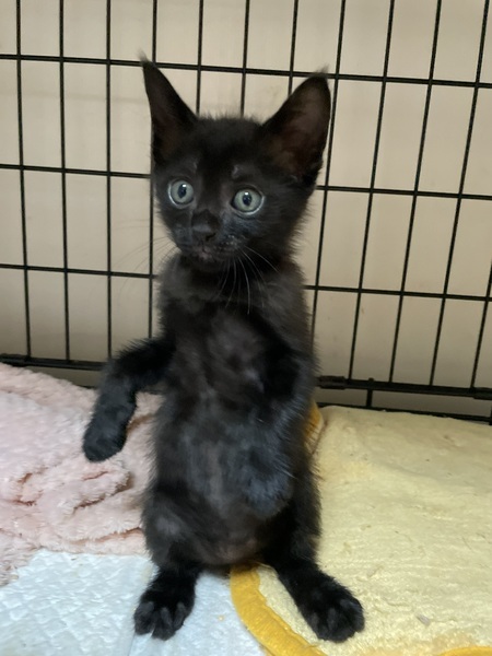 | 特徴(性格など) | とても人懐っこい黒猫ちゃんです。 立つのが得意です。 ノミダニ駆除、ワクチン一回、血液検査済み。エイズと白血病もマイナス。 |