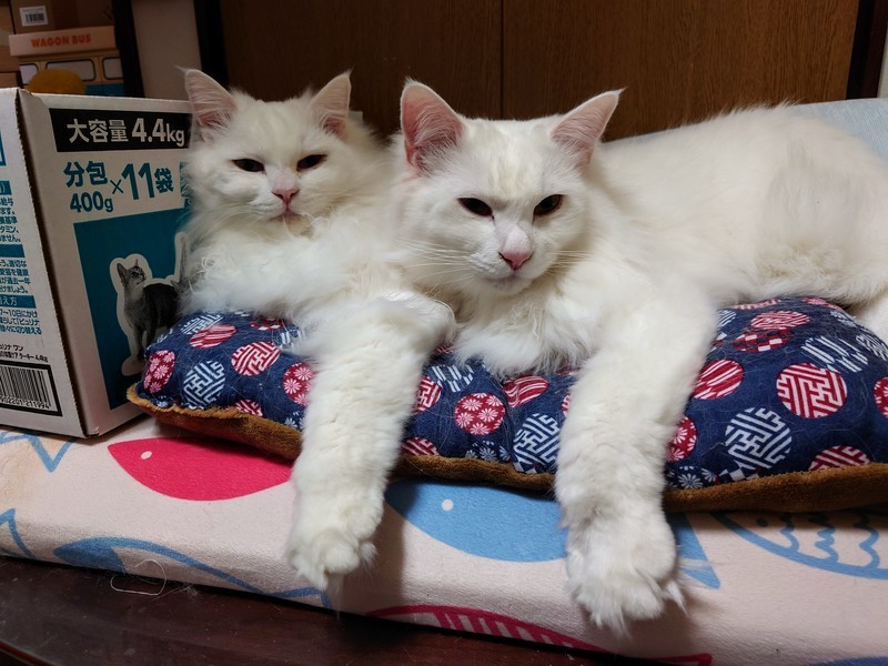 | 特徴(性格など) | 真っ白ふわふわの兄妹。 男の子はオッドアイで鍵しっぽ。 女の子はブルーアイ。 ふたりとも甘えん坊。 母親がチンチラシルバー。 |