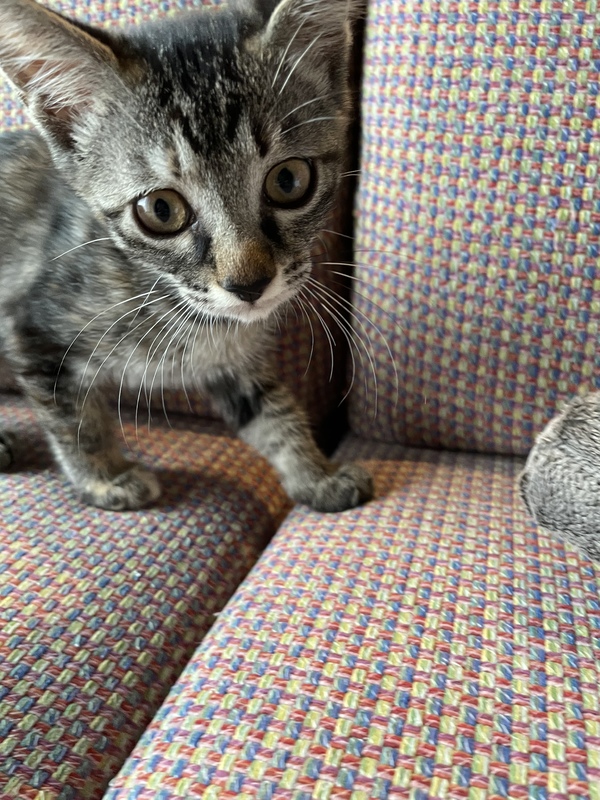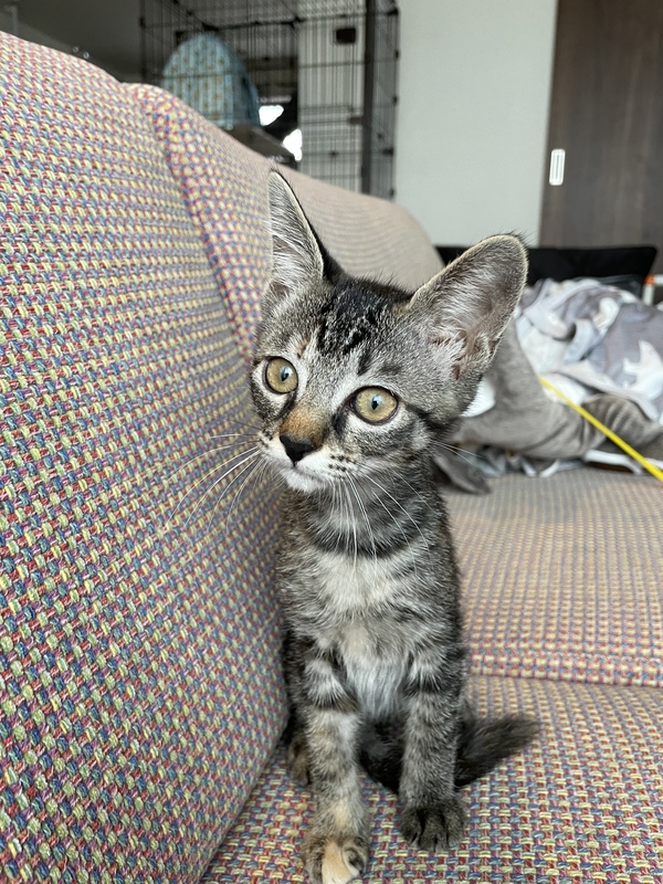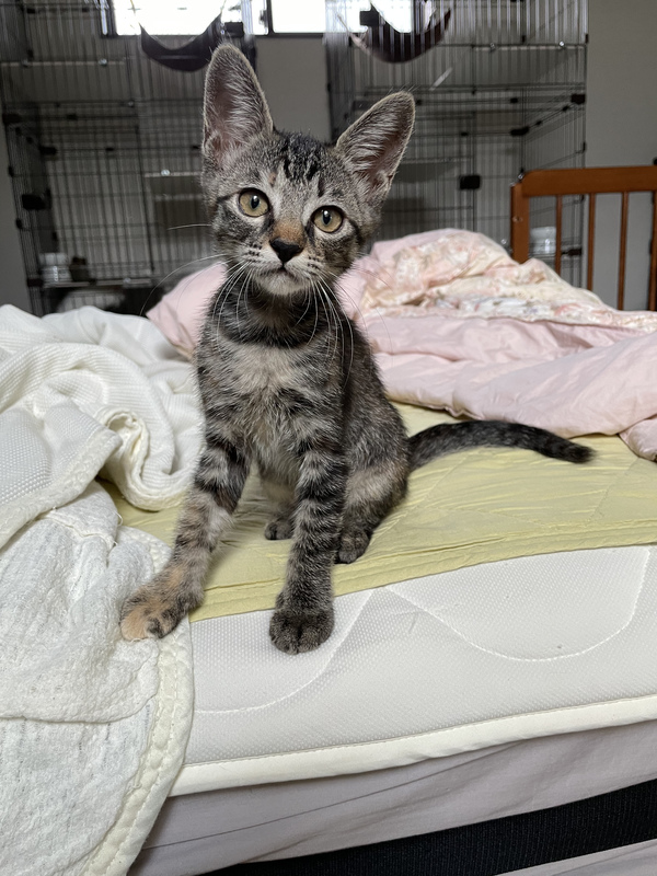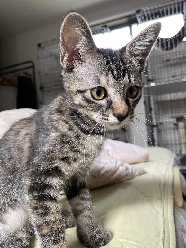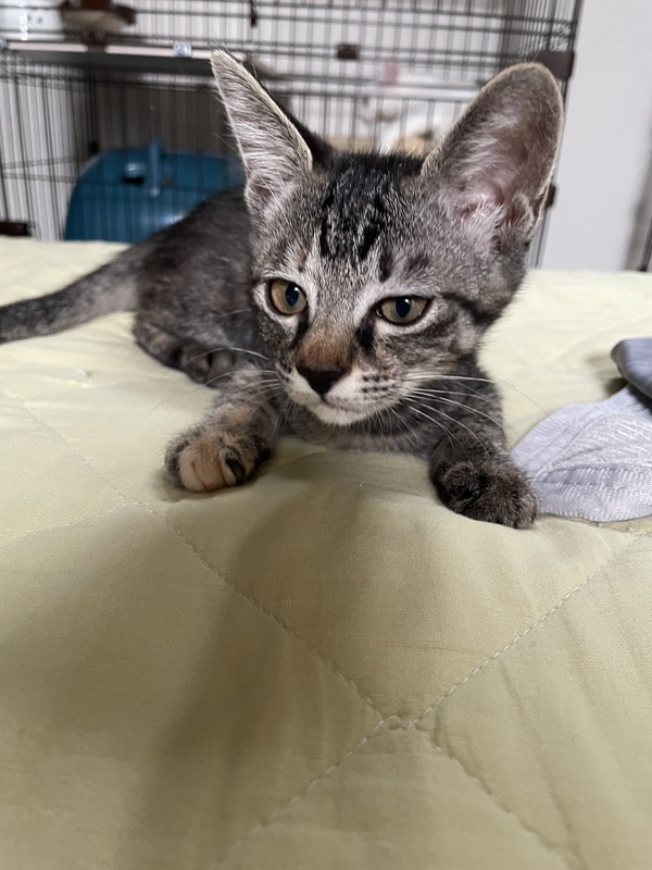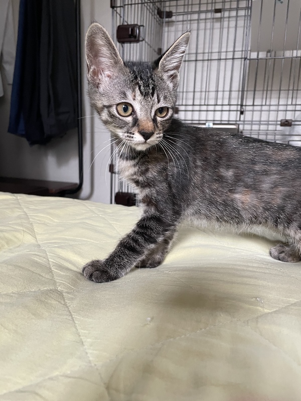 | 特徴(性格など) | 人馴れしていて寄ってきてペロペロしてくれます。抱っこもできます、とても可愛いです。細く小さくてか弱い見た目ですが、好奇心旺盛なすばしっこい元気な女の子です。 トイレトレーニング済みです。 FIV抗体(猫エイズ)陽性 FeLV抗原(猫白血病)陰性 3種混合ワクチン1回接種済みです。7月半ば(生後3ヶ月頃)に2回目のワクチンを接種予定です。 |