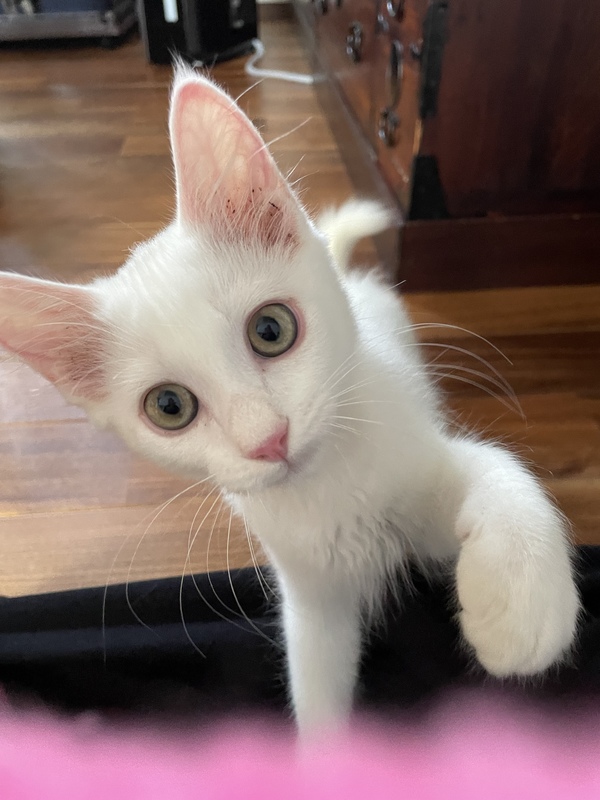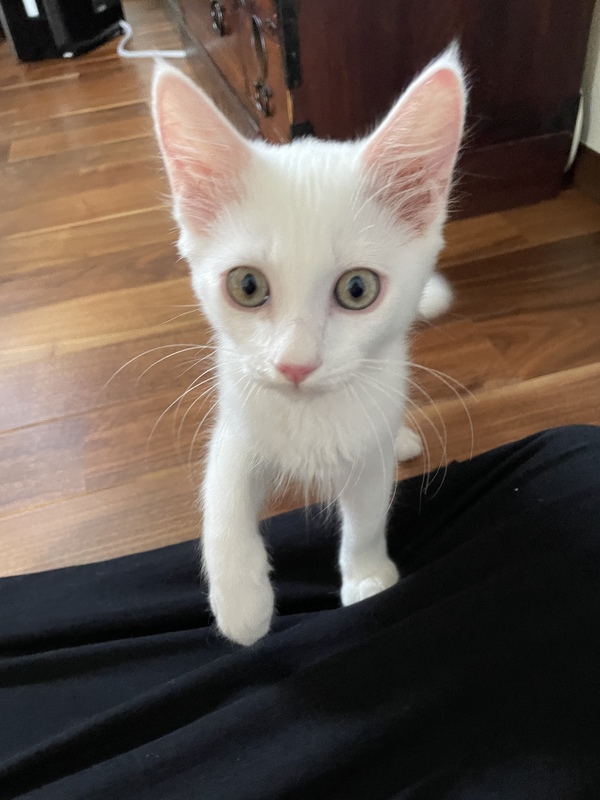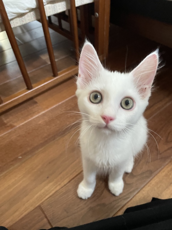 | 特徴(性格など) | とても人馴れしていています!甘えん坊でこれでもかというくらいノドをゴロゴロ鳴らします。ペロペロもします。ふわふわでとても可愛い白猫です。 トイレトレーニング済みです。 FIV抗体(猫エイズ)陽性 FeLV抗原(猫白血病)陰性 3種混合ワクチン1回接種済みです。7月半ば(生後3ヶ月頃)に2回目のワクチンを接種予定です。 |