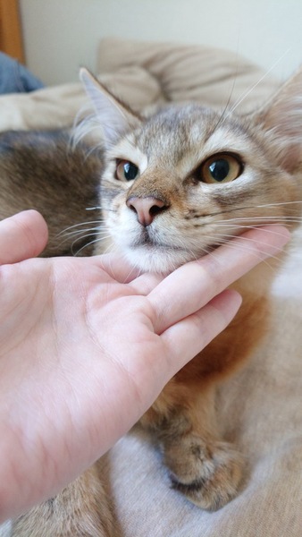 | 特徴(性格など) | 人が大好きな甘えん坊* ちょっと近付くだけでもゴロゴロ言っちゃいます。撫でられるのが好きで顔を凄く擦り付けながらフミフミします。 抱っこも大人しくさせてくれます。 目やに取り、耳掃除等のお手入れも大人しく良い子です。 甘噛みは一切された事ありません。 構ってほしい時等のアピールも優しくトントンしてくるだけで、爪も全く出さないので肉球が優しくプニプニ当たるだけです。 顔は大人びていますがまだ子猫なので走り回って元気です。 |