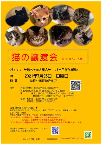 | その他(譲渡条件など) | 7/25の譲渡会(保土ケ谷区川島第三町内会館)に参加します。 譲渡会に参加希望の方はご予約をお願いいたします。 譲渡会にて里親さまが決まらなかった場合は個別のお見合いもお受けいたします。 お問い合わせください。 月 日 2021年7月25日 日曜日 時 間 13時~15時30分まで 場所 神奈川県横浜市保土ケ谷区川島町360-6 川島第三町内会館(川島地域ケアプラザ裏側) 車 保土ケ谷バイパス新桜ヶ丘インターから8分 駐車場若干 近隣にコインパーキングあり 電車 相鉄線 上星川駅より徒歩12分 相鉄線 西谷駅より徒歩15分 ★里親希望さまへお願い★ 必ず予約をしてからおいでください。 各回 20分 3組様 ご参加の際はマスク着用・アルコール消毒にご協力ください。 譲渡条件があります。お問い合わせください。 ご確認の上、ご応募ください。 猫の譲渡は先着順ではありません。 ◆ご応募時に下記事項をお知らせください◆ 1.お名前、簡単な住所 2.先住動物の有無(ワクチン 不妊手術の有無等)と選んだ理由 3.家族構成(家族全員の年齢 関係 お仕事等) 4.住宅環境(一戸建て 分譲マンション 一戸建て賃貸 賃貸マンションペット可) 5.留守番の時間 6.下記の①~⑧までの同意 ◆応募者様へのお願い◆ ①一生涯、家族の一員としてくださる事(猫は20年生きます) ②完全室内飼いでお願いします。 (脱走防止対策をお願いします。ケージ 脱走防止扉 玄関窓等) ③不妊手術及び毎年のワクチン接種など健康管理 (不妊手術済のご連絡は必須) ④家族全員の同意があること ⑤ペット可住宅にお住まいであること。 (ペット不可にお住まいの方には譲渡できません) ⑥身分証明の提示及び誓約書を記入していただきます。 ⑦譲渡後の近況報告をしていただける方 ⑧譲渡費用等をご負担できる方 (初期医療行為は済ませてお届けします) 猫が小さいのでお留守番の短い家を希望します。 ケージのご用意をお願いいたします。 申し訳ありませんが先住動物さんが3匹以上のご家庭はお断りさせていただいております。 無職 学生 未成年の方からの申込は受け付けておりません。 ご家族に未就学児のいるお家及び高齢者の方は要相談 2匹一緒を優先させていただきます。 双方の条件が合った場合は保護先にお見合にきていだだき成立後に自宅室内へお届けいたします。 この時期なので近くに方を優先させていただく事もあります。 ご応募まってます♪ にゃんころ隊 http://nyankorotai.blog.fc2.com/ |
