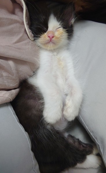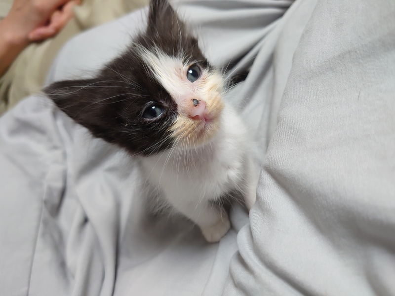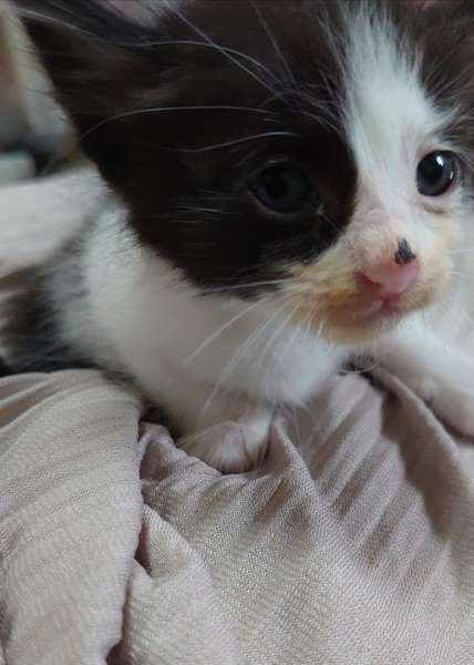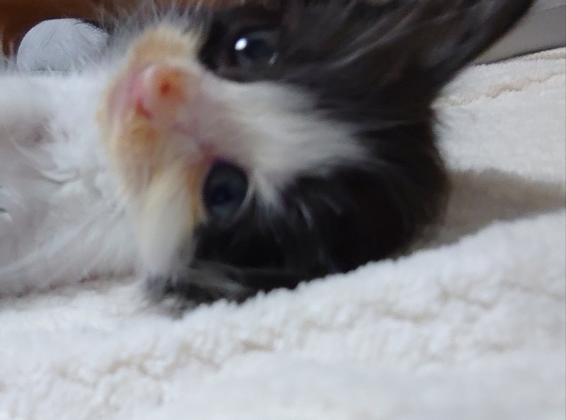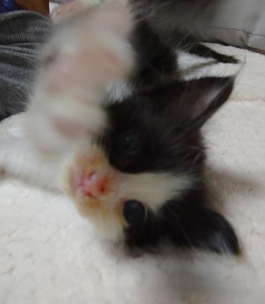 | 特徴(性格など) | ハチワレの可愛い男の子です! 人懐っこく、毎晩ピッタリくっついて寝ています。 遊ぶのが大好きで、「遊んで〜」と人の後をひよこのように追いかけてきます。 お母さん猫が構ってくれなかった分、甘えん坊なのかもしれせん。 身体も大きくなり、出来ることがふえ、 元気に走り回っています。 呼んだら走ってきます✨ ご飯をよく食べます! いくつかの写真に写っている鼻の模様はかさぶたで、今は取れています。 |