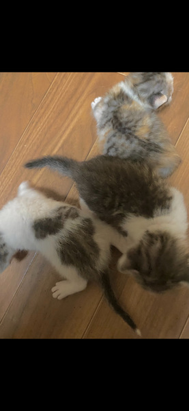 | 特徴(性格など) | ①キジ白 (先天性??左手前脚が曲がってます。痛がる様子はなく、とても元気でヨチヨチ歩いています) ②白メインのキジ →最初の写真の子です。 ③キジ三毛 みんなとても可愛いお顔で元気な様子です! |