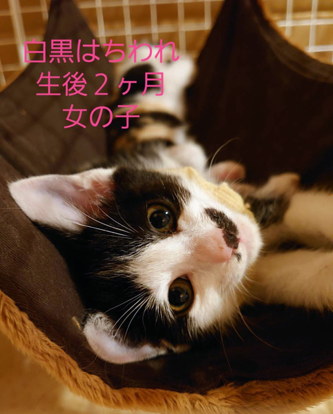 | 特徴(性格など) | 仮名はなちゃん 可愛い白黒の、はちわれさんひげ女子です、甘えん坊さんで遊ぶの大好きですよ。 ワクチン近い内に接種予定です 駆虫中 ノミダニ駆除済み エイズ白血病検査お母さん猫でしてます、共に陰性です。 |
