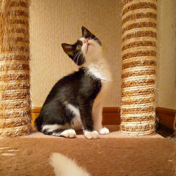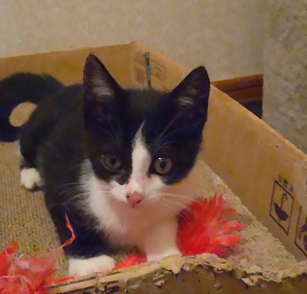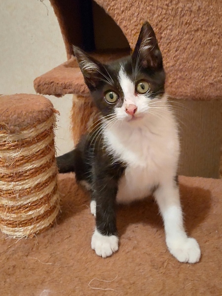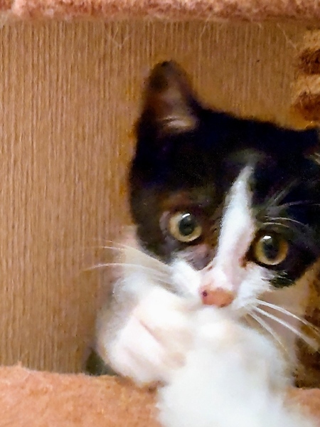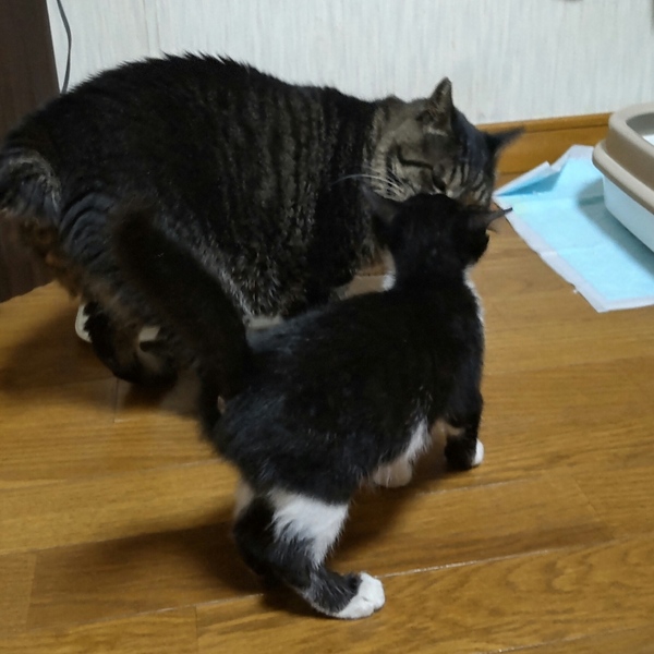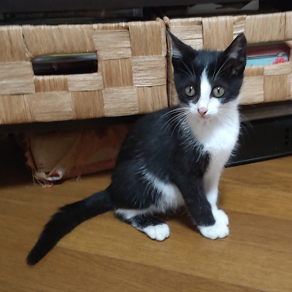 | 特徴(性格など) | 仮の名:セブン。 柄:ハチワレ 月齢:2ヶ月半位 1.1㌔ しっぽは長いです。 遊びも激しくなり子猫らしい仕草も見られる様になったセブン。抱っこもできます。保護してからずっとシャーもなく、人も猫も大好きな男の子です。 |