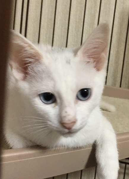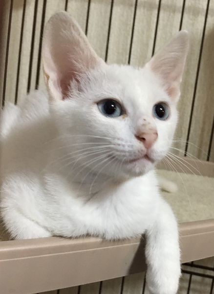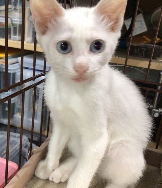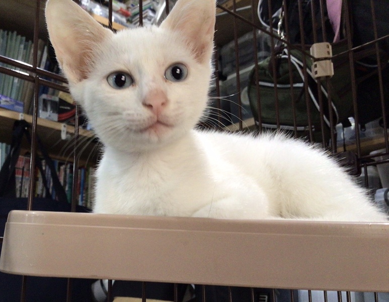 | 特徴(性格など) | お目々まん丸なブルーアイの女の子。 人懐っこく甘えん坊です。 人間観察が得意でよく人を見ています。賢い子と思います。 兄妹でのお迎えも歓迎します。 ノミダニ駆除、駆虫、ワクチン一回済み。 血液検査済み。エイズと白血病もマイナス。 24日山口市道場門前のさぽらんてで開催される保護ねこ譲渡会に参加予定です。詳しくは譲渡会情報をご覧ください。 |