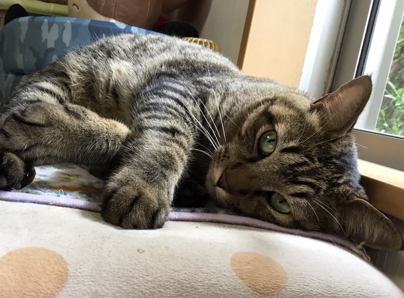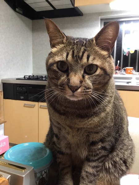 | 特徴(性格など) | キジトラの男の子です。 性格は温厚で甘えたさんです。 最初は人見知りをしますが、数時間もすると慣れ慣れしくなります(笑) 名前を呼ぶと走って来てスリスリと足や手に甘えて来ます♪ 良く走り回るとても身軽なおデブちゃんです(^_^;) 体重は5.5kgあります。 シッポは短くて気持ち程度に付いてます(笑) チュールやクリスピーキッスが好きです♪ |