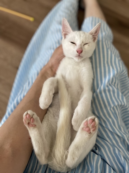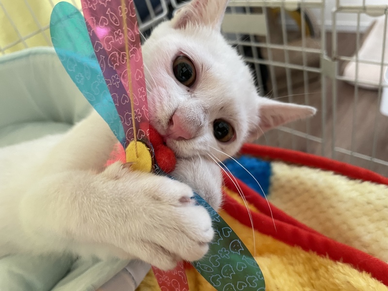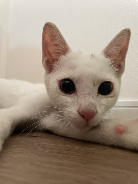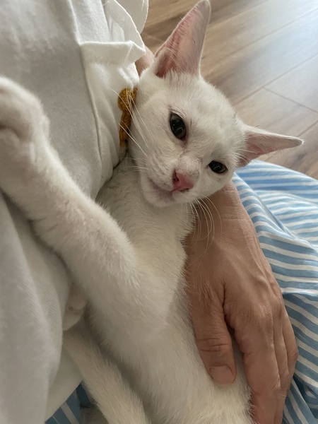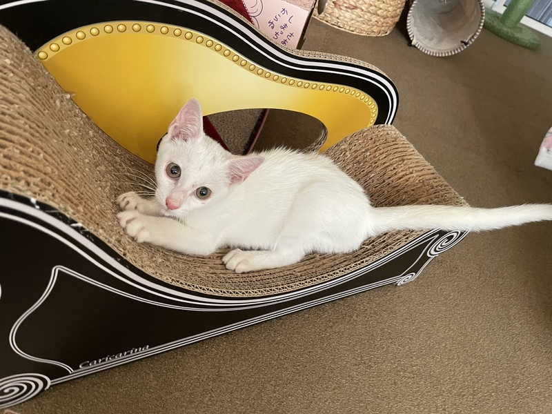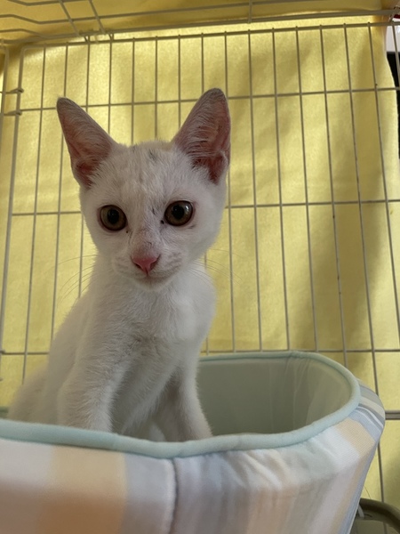 | 特徴(性格など) | 全身白くて頭に少しグレーの点々があります。 大人になって消える子もいるようです。 人馴れしていて、甘えん坊! たくさん遊んでたくさん食べる健康優良児です♪ ウイルス検査:エイズ、白血病ともに陰性 |
