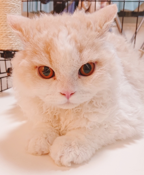 | 特徴(性格など) | 写真より実物の方が可愛いです(*^^*) 色はクリーム&ホワイトという感じです*毛がくるくるしていて羊みたいにフワフワしています* 性格は少し臆病な感じで音に敏感です。 猫じゃらしやオモチャが好きでとても楽しそうに遊びます♪ よくマンチ立ちしながら猫じゃらしで遊びます♪ 他猫が苦手な様なので1匹飼いして頂ける方でお願い致しますm(_ _)m |