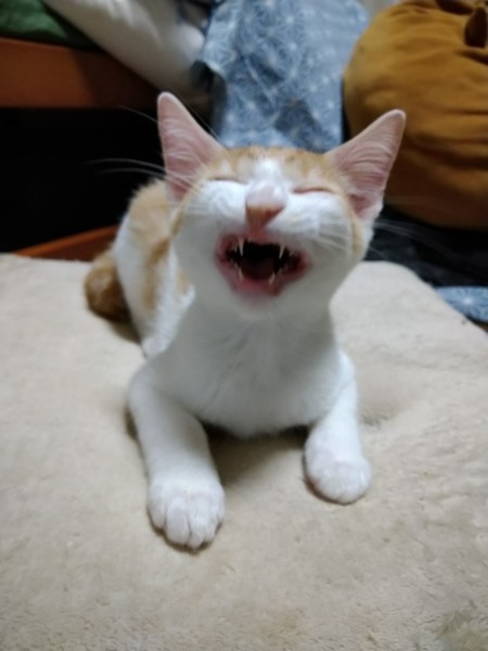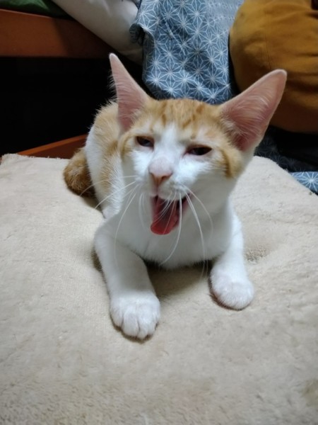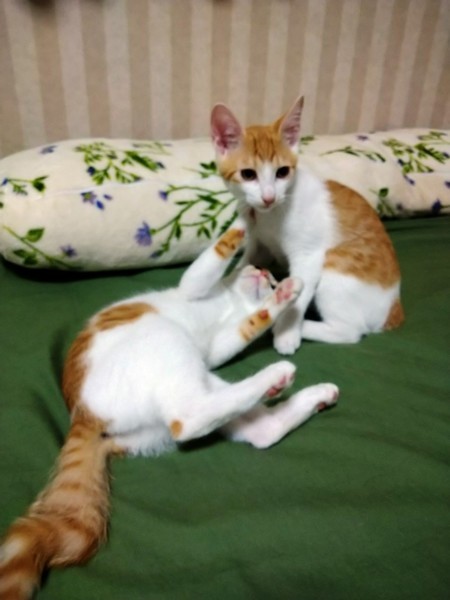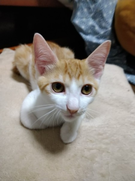 | 特徴(性格など) | 2021.3.30生まれ 毛色:茶白 カギしっぽの茶白の男の子。 好奇心旺盛で兄妹で一番はじめに行動します♪ 同居のオトナ猫にいたずらして怒られてもめげません。 少し人見知りですが、慣れると膝の上でお昼寝したりします♡ 他のネコとくっついて寝るのも好きです。 兄妹でのにゃんプロや猫じゃらしが大好きです!! |