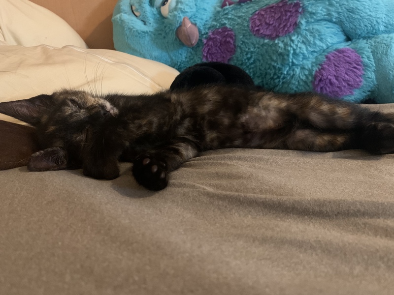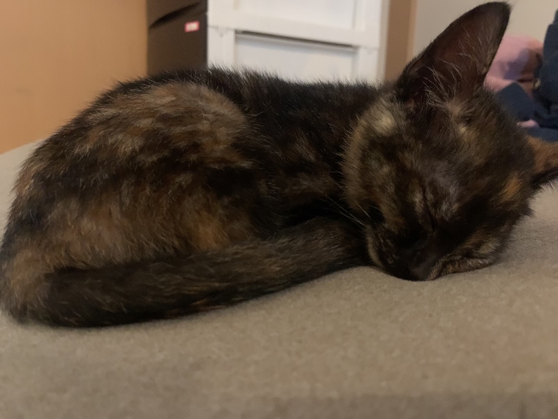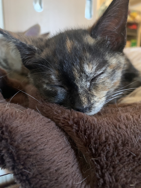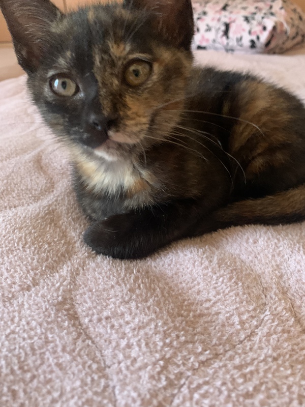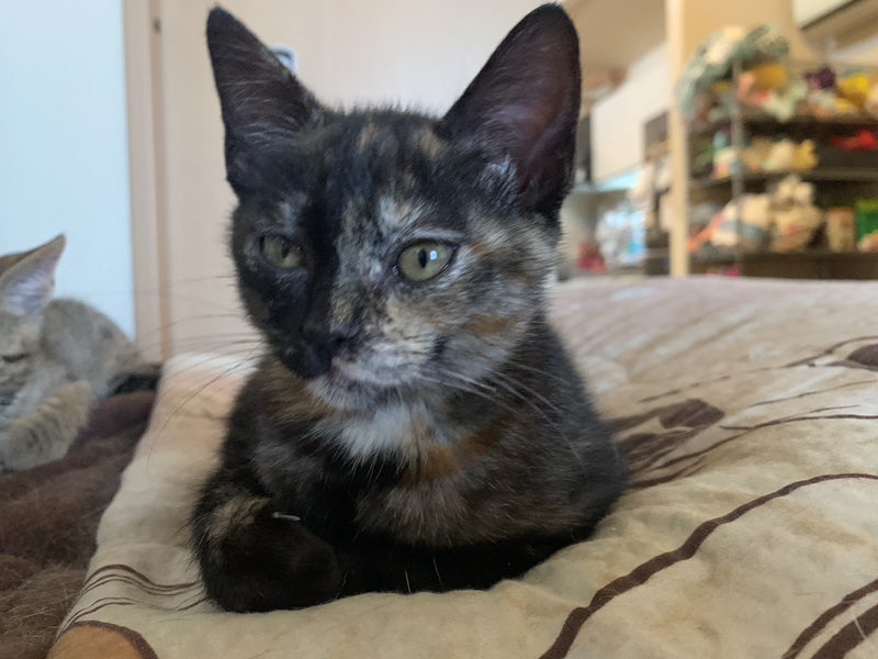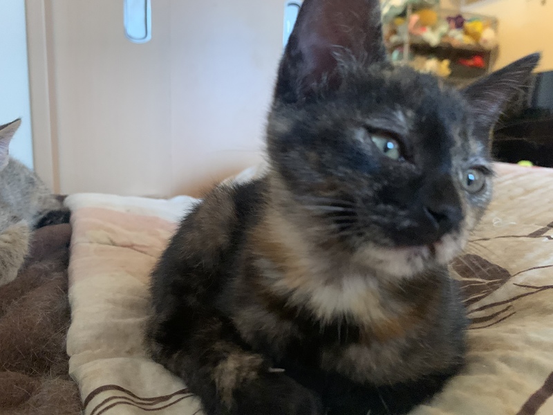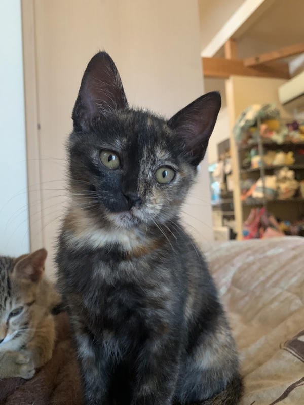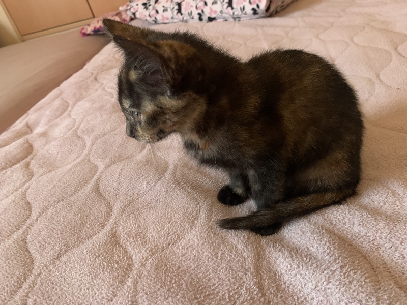| 特徴(性格など) | サビ柄の元気な女の子です。生後2ヶ月半から3ヶ月くらいかと思います。 保護された時は風邪をひいていたので、病院で駆虫薬と注射をしてもらい、風邪薬を飲ませていました。今は毎日元気に走り回っています。 人懐っこく、何か作業をしていると寄ってきます。我が家の猫たちとも仲良くしています。 保護した2週間後くらいに猫エイズと白血病の検査をして、陰性でした。 |