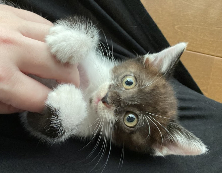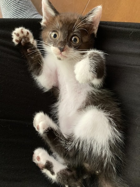 | 特徴(性格など) | 仮名を 幸(こう)君と言います。 「幸せを掴むように」の「幸」を「こう」と読みました。 元気いっぱい遊びざかりの男の子です。 とにかく遊ぶの大好き。 ねこボールなどのおもちゃ大好き。 「遊びたい」の気持ちと同じくらい人が好きで、人馴れ完璧の甘えんぼです。 ドライフードがお気に入りです。 ほぼ黒色の白黒君です。 耳先や、手足、腹など部分的にポイント白になっています。 保護時は猫風邪が酷かったのですが、目薬・飲み薬で完治しました。 7月4日の保護時に獣医さんの見立てでは、1ヶ月過ぎと診断されました。 |