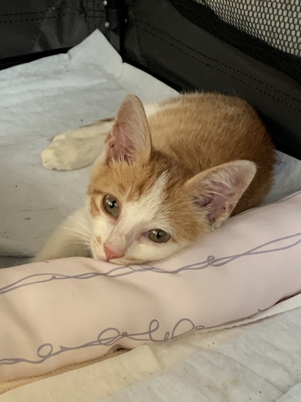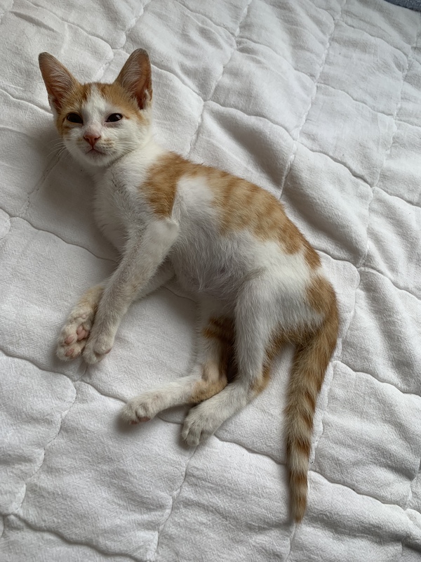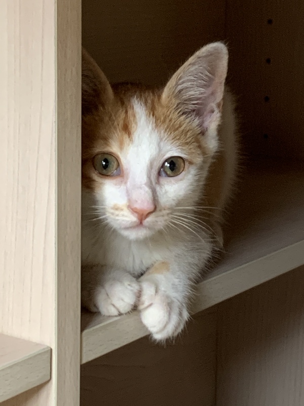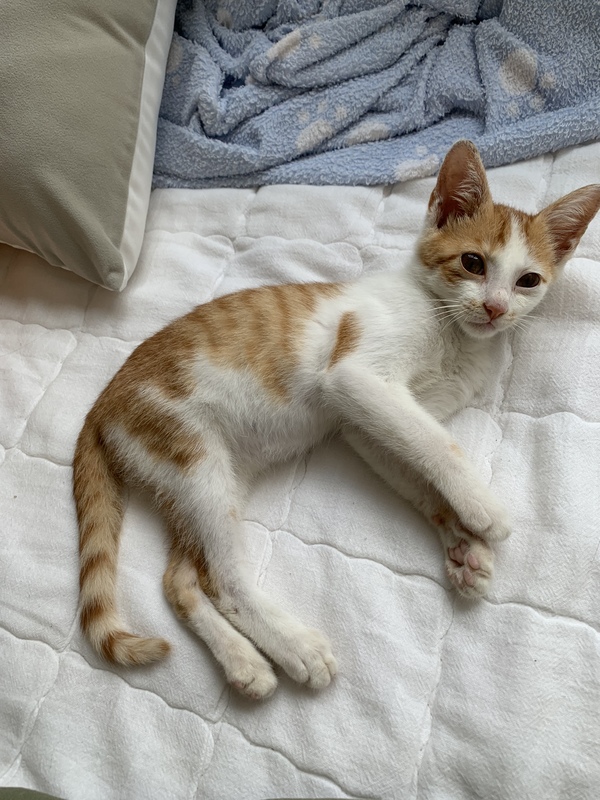 | 特徴(性格など) | 近所で一人鳴いているところを保護。甘えん坊で人馴れしています。 尻尾はまっすぐで長め。 手足もスラリと長い子です。 駆虫薬投与済みです。 |