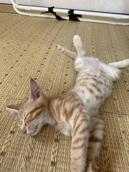 | 特徴(性格など) | ◼︎色柄:茶トラ生地模様 ◼︎性格:ヤンチャで走り回るのが好きな男の子です。好奇心旺盛で何事にも興味を持ちます。とにかく遊ぶのが好きです。優しい子で甘えん坊のなのですが、少し臆病で寂しがりやの一面もあります。 |