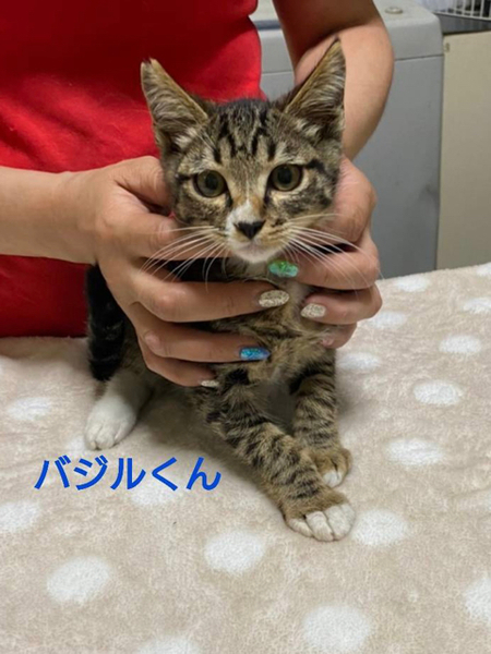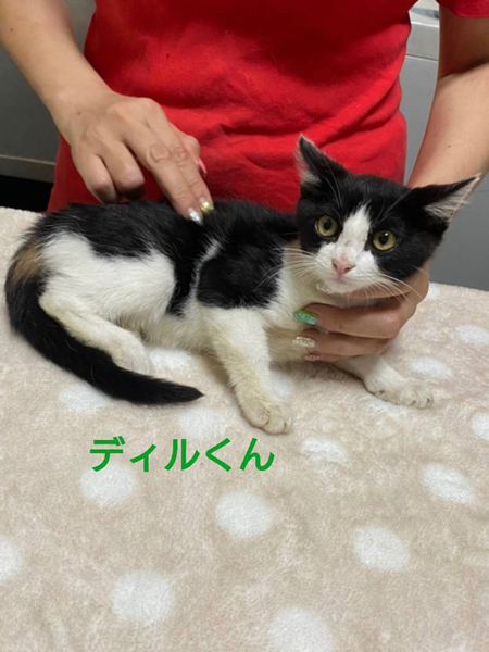 | 特徴(性格など) | 仮名「ディルくん」 ワクチン済み、駆虫済み、ウイルス検査白血病、エイズ共に陰性 黒白の男の子。 おとなしい性格の男の子です。 まだ保護したばかりで自分から寄ってきたりはしませんが環境の変化に慣れれば甘えてくる優しい性格の子だと思います。 小学校高学年以上でしたらお子さんのいるご家庭、初めて猫を飼う方でも大丈夫です。 去勢手術も終わってます。 1匹での譲渡も可能ですが環境変化のストレス軽減の為に、兄妹とお迎えして頂けるとお留守番や普段のお世話なども楽だと思います。 |