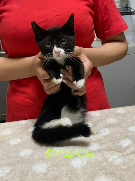 | 特徴(性格など) | 仮名「タイムくん」 ワクチン済み、駆虫済み、ウイルス検査白血病、エイズ共に陰性 黒白の男の子。 おとなしい性格です。 環境の変化に慣れれば甘ったれな子になると思います。 抱っこもさせてくれます。 小学校高学年以上でしたらお子さんのいるご家庭、初めて猫を飼う方でも大丈夫です。 去勢手術も終わってます。 1匹での譲渡も可能ですが環境変化のストレス軽減の為に、兄妹とお迎えして頂けるとお留守番や普段のお世話なども楽だと思います。 |