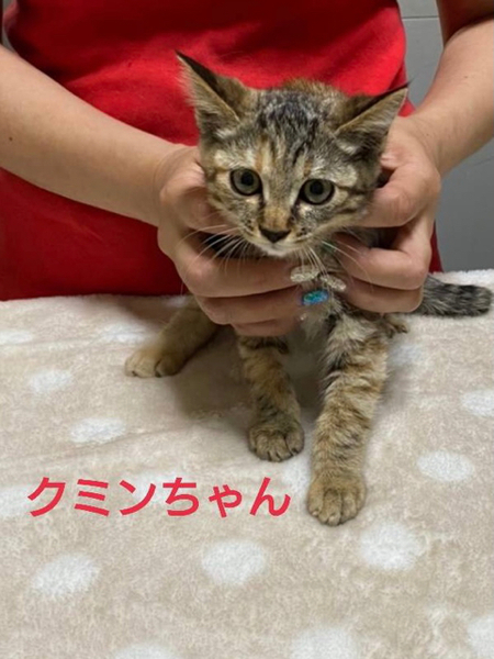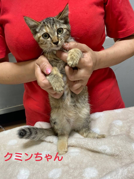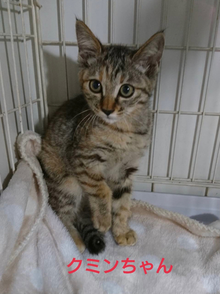 | 特徴(性格など) | 仮名「クミンちゃん」 ワクチン済み、駆虫済み、ウイルス検査白血病、エイズ共に陰性 麦わらの女の子。 好奇心旺盛な女の子です。 人にも興味がある様で寄ってきます。 抱っこもさせてくれます。 美人な女の子です。 小学校高学年以上でしたらお子さんのいるご家庭、初めて猫を飼う方でも大丈夫です。 1匹での譲渡も可能ですが環境変化のストレス軽減の為に、兄妹とお迎えして頂けるとお留守番や普段のお世話なども楽だと思います。 |