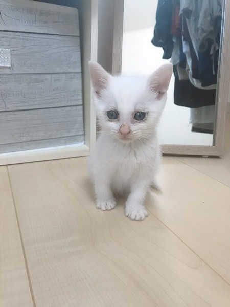 | 特徴(性格など) | 真っ白で元気いっぱいです。少し困ったお顔の可愛い子猫です | ||