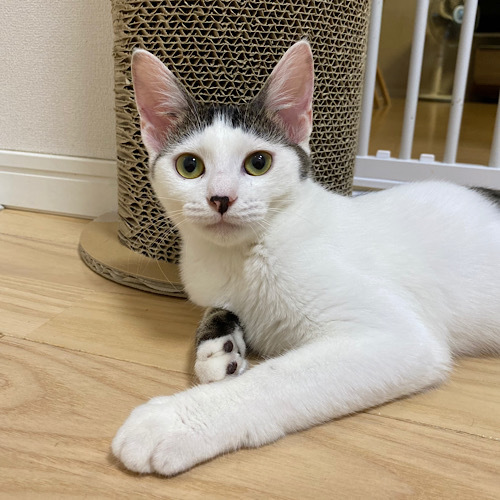 | 特徴(性格など) | 綺麗に揃った前髪の様な模様がチャームポイントのおかっぱまる子ちゃんです。 目が合うとにゃーと鳴きながら近寄って来る甘えん坊です。しっぽはご機嫌にピンと立てて、ゴロゴロと喉を鳴らして愛情表現をしてくれます。 前髪姉妹のメルちゃんと一緒に膝の上に乗り仲良くお昼寝をする事もあれば、膝の上争奪戦を繰り広げる事もあります。 保護時に真菌(猫カビ)に感染しており、治癒しました。現在は体も大きくなり抵抗力がついた為、健康状態は良好です。 |