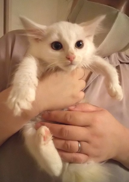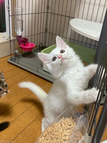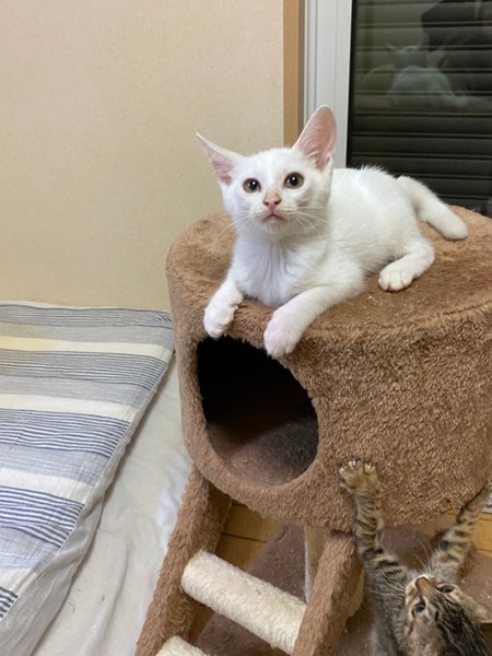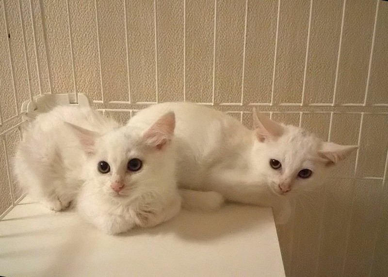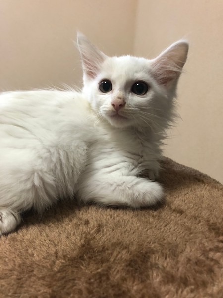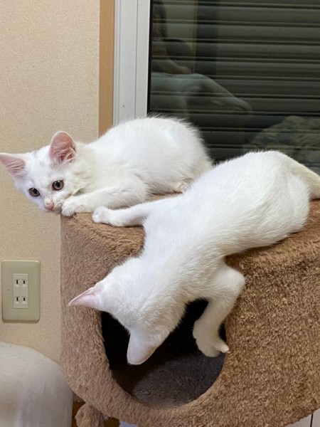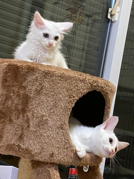 | 特徴(性格など) | 2ヶ月ほどのとても可愛い兄妹です。 長毛の白の女の子 (レモン) 白の男の子です。(モモ) ただいま人馴れ修行中で日に日に良い子になってきました。 初めて人には人見知りをしますが少しすると心を開きます。 モリモリ食べて元気いっぱいです。 寝るときも遊ぶ時も仲良しでいつもピッタリ寄り添ってます。 ●健康診断済み ●ウイルス検査(白血病とエイズ)マイナス ●3種ワクチン1回済み(7/2) ●便検査済み ●投薬済み (ノミ等駆除) ●現在約1キロです。(7/25現在) |