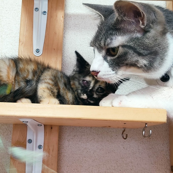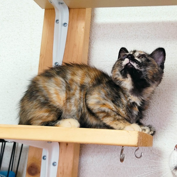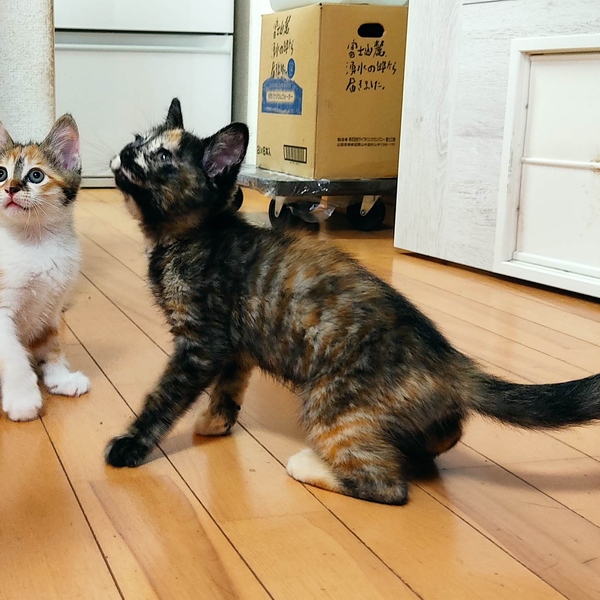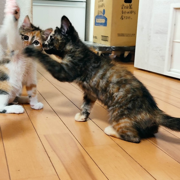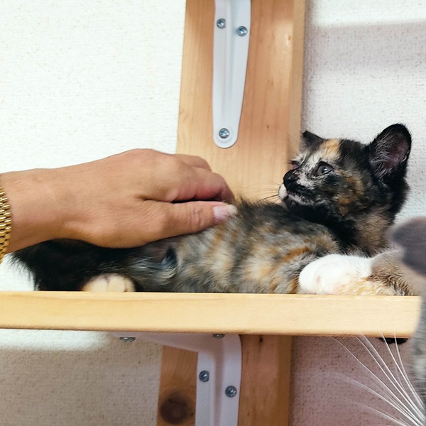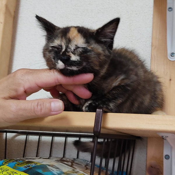 | 特徴(性格など) | とにかくベタベタ人馴れ抜群のサビ猫の女の子です!動きがちょこちょこ可愛くて、女の子らしい子です。人が大好きで夜は私にくっついて寝ています。先住にゃんこ達にも可愛がられています。人も猫も大好きな子です。しっぽは長いです。 |