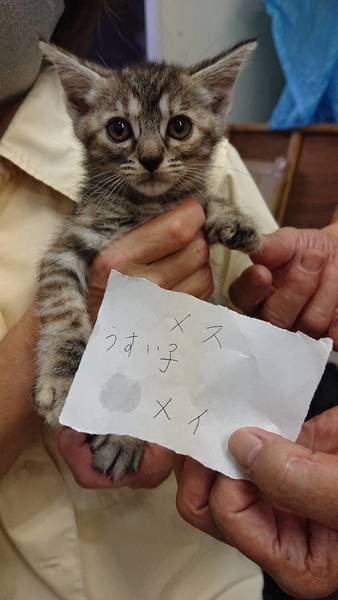 | 特徴(性格など) | キジトラ(色が薄い子)。 ベタ慣れ。 人好き。 抱っこ大好き。 おてんば。 食欲旺盛。 |