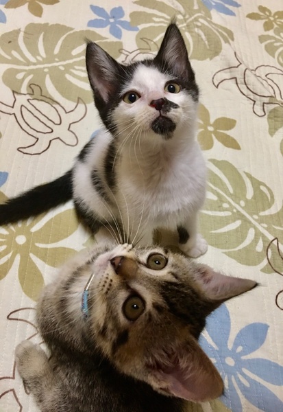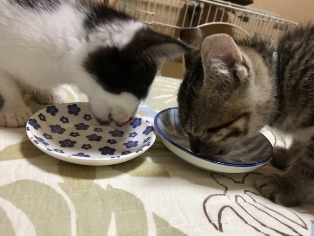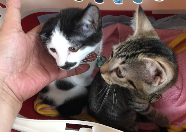 | 特徴(性格など) | 豆(白黒)オス1100g 少し臆病ですが口角を思い切り上げて目を瞑り、ニャーと要求する鳴き方が可愛らしいです。憎めないぶさ可愛い顔。大福の後から500g代で保護。 大福(キジ)オス1200g 300gから人が育てているのでめちゃくちゃ懐こくてやんちゃで可愛い顔をしています。 ●2匹共 ワクチン1回済み ノミダニ駆虫済み 検便2回クリア ウィルス検査は4ヶ月齢予定 |