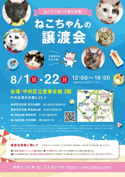 | その他(譲渡条件など) | 【新型コロナウィルス感染予防対策について】 譲渡会開催に際し、ご来場下さいます皆様には以下の内容をご理解頂き、ご協力頂けます様お願い申し上げます。 ●入場前の検温とアルコール消毒の実施 ●マスク着用でのご入場=マスク未着用でのご入場はお断り致します ●入場人数の制限をさせていただきます ●時間と人数の制限=密になる事を防ぐ為に入場人数とお時間の制限を設けさせて頂きます その為お待たせしてしまう場合もございます ●会場利用規約により、ご来場者様の連絡先を控えさせていただきます あらかじめご了承下さい 里親様決定は14時以降となります。 その後、迎え入れ準備の説明等のお時間も頂戴しますので、お時間に余裕を持ってご来場下さい。 諸々の制限がございますが、安心・安全な譲渡会運営のためにご理解・ご協力いただきますようお願い申し上げます。 ~~~~~~~~~~~~~~~~~~~~~~~~~~~~~~ ★仔猫ご希望の里親様★ 仔猫ちゃんたちは、まだ体がしっかりしていない赤ちゃんです。 下痢だけでも数時間対応ができなかっただけ死に至る事もあります。 その為、月齢に応じたお留守番時間を設けさせていただいております。 また、子猫ちゃん(6ヶ月未満)の里親様には子猫支援金のご協力をお願い致しております。 ★猫ちゃんとのお見合いは譲渡会で!★ ねこざんまいの猫ちゃんは譲渡会でのお見合いのみとなります。 『この子はいつ譲渡会に参加するの?』『譲渡会場の場所はどこ?』など はねこざんまいホームページをご覧ください。 https://neko3mai.com/ ★楽しく猫ちゃんと触れ合って★ ねこざんまい譲渡会は、猫ちゃんも里親様も保護主も笑顔で過ごせる譲渡会を目指しています。 これから20年以上、楽しい時も、悲しい時もいつも傍にいてくれる大切な家族になる猫ちゃんです。 会場には沢山の猫ちゃんがいます。 1匹1匹、触れ合って猫ちゃんとお話ししてください。 『初めて猫ちゃんを家族に迎える方』 『先住猫ちゃんのお友達を迎える方』など トライアルの仕方や先住猫ちゃんと仲良くなるコツなど経験豊富な保護主やスタッフにお気軽にご相談ください! 猫を愛し、そして猫に愛されている猫好きスタッフと保護主がアドバイスさせていただきます。 ★里親希望のみなさまへ★ ペットではなく、家族一員としてたっぷり愛情を注いでくださるご家庭をお待ちしております。 恐れ入りますが、 ・学生の方 ・一人暮らし、同棲中の方 ・子猫、若猫希望の60歳以上のみのご家庭 ・脱走防止対策にご協力いただけない方 は原則譲渡を遠慮させていただいております。 ただし、預かりボランティアさんとして新しい家族が決まるまでの間、猫ちゃんを預かっていただく道もございます。 参加猫ちゃんは、それぞれ保護主(実際に猫ちゃんを自宅に入れ、保護をしている方)が異なります。 詳しい条件なども異なる場合がございますので、会場内で直接保護主とお話ください。 〖共通条件〗 1.終生飼育 2.完全室内飼い 3.脱走防止対策へのご協力 4.避妊去勢手術 5.契約書類へのサイン 6.定期報告 7.医療費等の負担 当日の猫ちゃんを連れて帰ることはできません。後日、保護主が里親様のご自宅までお届け致します。 その為、移動の際の猫ちゃんの負担を月齢などから考慮し、お届け地区を限定させて頂くこともございますのでご了承ください。 ご理解とご協力のほど宜しくお願い致します。 ☆よくある質問☆ ・譲渡の条件 ・ご負担頂く費用 ・譲渡会の場所等は ホームページに詳しく掲載させて頂いておりますのでご覧ください。 https://neko3mai.com/ メールでのお問い合わせはすぐにご返答出来ない場合がございますのでご了承ください。 ホームページ https://neko3mai.com/ お問い合わせ http://www.neko3mai.com/contact/form_general.html ねこざんまいブログ http://ameblo.jp/neko3mai/ |