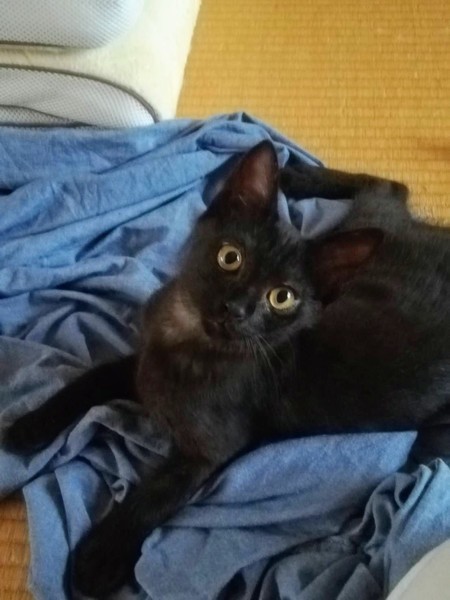 | 特徴(性格など) | とても人懐っこいです。 甘えん坊で、ちょっとおっとりしているかも。 大きな猫も大好き。 真っ黒ではなく、うっすら縞模様です。 すらりと長い手足しっぽが魅力。 |