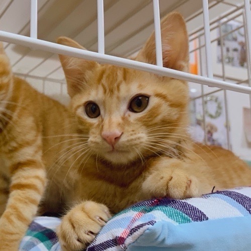 | 特徴(性格など) | 少し怖がりさんで、最初の頃は手も口も出ていましたが、 家猫修行のおかげで、今は怯えた顔をするだけになりました! 何かあるとすぐにルネくんの後ろにお隠れになります(笑) ビビりながらも、活力と好奇心に満ちていて、 いつも目がキラッキラしています。 まだべた馴れとは言えませんが、 ちゅーる後に撫でるとゴロゴロゴロ♪急に甘えん坊になります。 恥ずかしがり屋さんで、すぐにお母さんのスカートに隠れてしまうのに、 慣れるとずんずん前に出てくる末っ子のやんちゃ坊主という感じでしょうか(笑) 今後の成長が楽しみです。 茶トラのルネくんとは仲良し兄弟です。 クリソツですが、カギ尻尾の方がレオくんです。 本来は5兄弟だったのですが、一足先に3匹は保護でき、 すでに新しいおうちが決まりました。 ママにしっかり守られていて3匹よりも 数日後にやっと保護できた茶トラブラザース。 とても仲良しなので、2匹一緒のお迎えも大歓迎です。 2匹とも甘々ボーイになるような気がします! 脱走対策、健康管理をしっかりして下さる里親様とご縁があると嬉しいです。 |