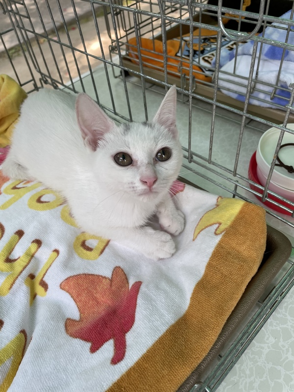 | 特徴(性格など) | 白猫ですが頭に黒が出て来ました とても大人しい仔猫です |