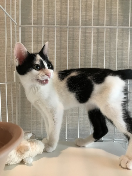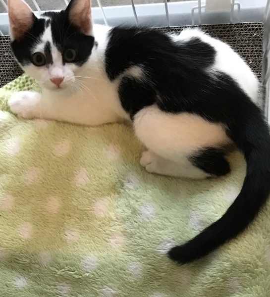 | 特徴(性格など) | ちょっと抱き上げただけでノドをゴロゴロ鳴らしちゃう甘えんぼ。毎日元気に走り回っています。油性ペンでお顔に線を描かれたみたいな模様がキュート。背中には大きなトカゲをおんぶしちゃってるみたいな模様が。山間の町で1匹でいるところを猫飼いのおっちゃんに保護されました。とにかく可愛い白黒猫です! | ||
