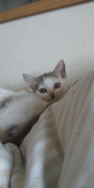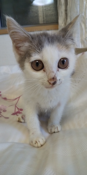 | 里親募集する理由 | 7月23日早朝に我が家の庭に突如現れました。ガリガリキズキズの状態ですぐに 病院に連れていき、ノミとり、ウイルス検査、便検査をしました。(すべて陰性) ご飯も保護当初はよほどおなかがすいていたのかガツガツ食べていました。 保護してからは、ごはんをあまり食べないので病院で診察して頂き下痢止めと吐き止めを 処方して頂きました。 保護当初は550ぐラムでしたが、8月1日は675グラムになりゆっくりですが 成長しています。8月13日は1015グラムまで大きくなりました。 我が家は、すでに保護猫でいっぱいなため 良い里親さんがいらっしゃれば譲渡をしたいです。 |