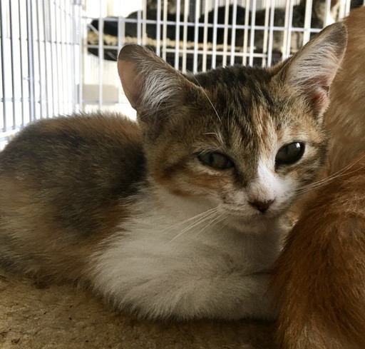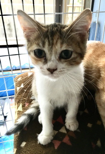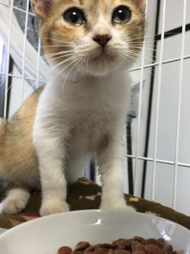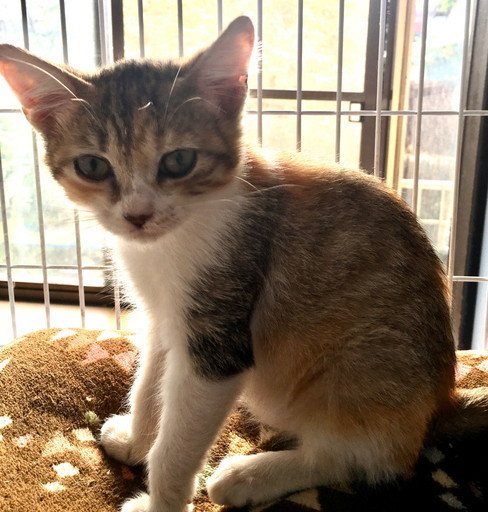 | 特徴(性格など) | 三毛猫の女の子です。 残念ながらエイズが陽性で、遺伝子検査も陽性でした。 それでも、とても元気で食欲も旺盛です。 兄弟の中で女の子1匹なので、みんなにかまわれてアイドルのようです。 目が大きくてうるうるなのが、キュンになります。 |
