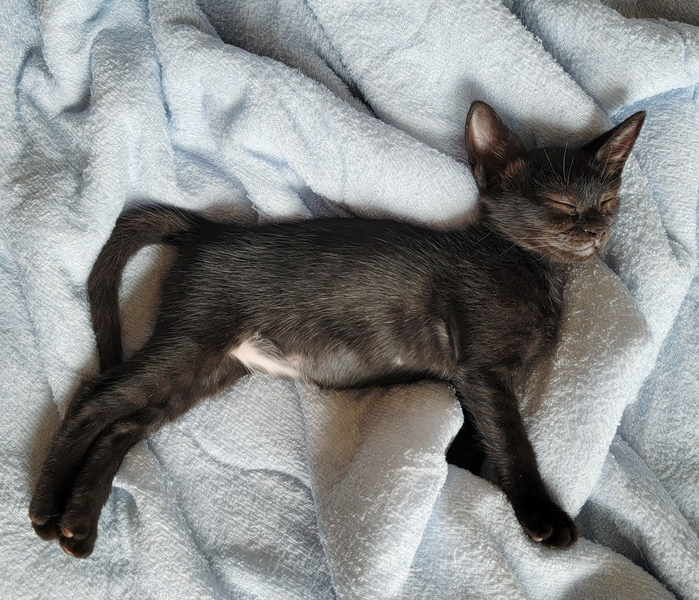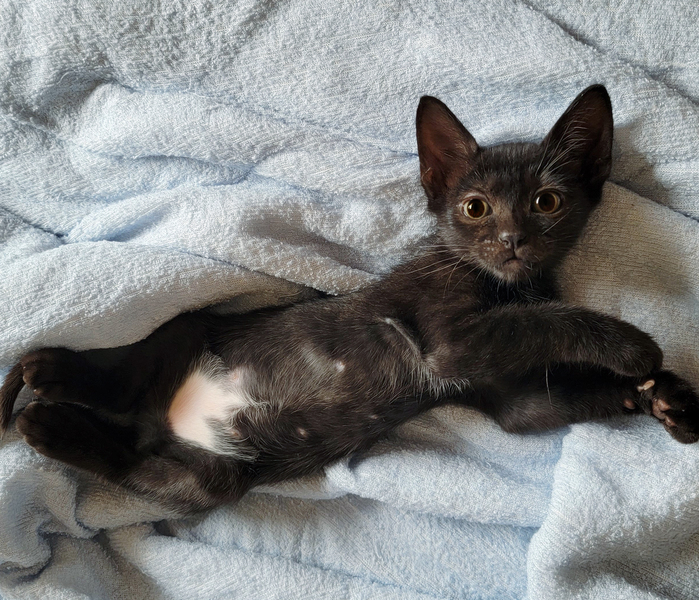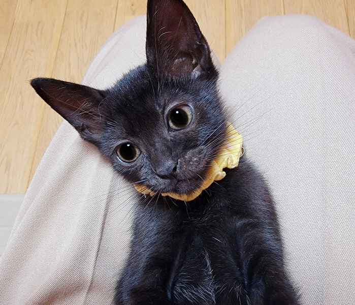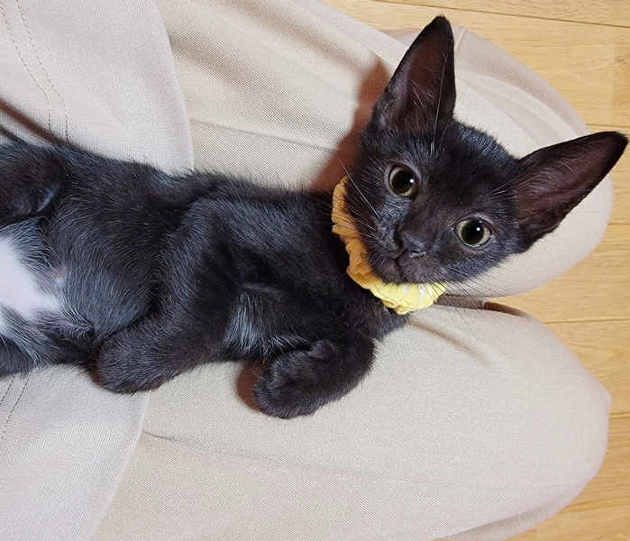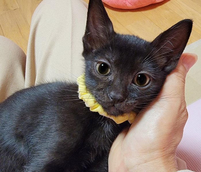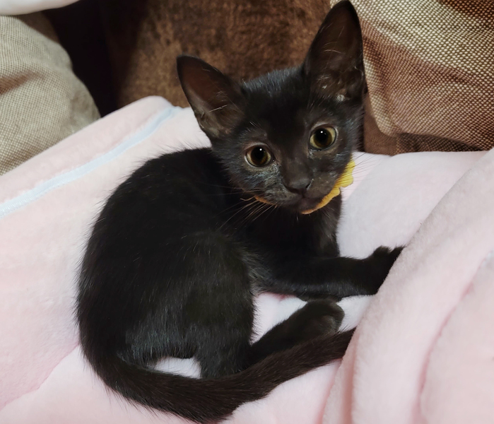 | 特徴(性格など) | 【健康状態】 よく食べ、よく遊び、元気いっぱいです♪ シャンプー・ブロードライン(駆虫)済み。 7/9(金) ウィルス検査済み。 エイズ・白血病ともに陰性で問題ありませんでした。 ※お引き渡しの際に、診療明細および領収証をお渡しいたします。 領収証に記載の金額以外は一切請求いたしませんので、ご安心くださいませ。 【特徴・性格】 生後2ヶ月ぐらいの、黒猫の女の子です。 母猫とはぐれてしまったようで、痩せて衰弱していたため保護いたしました。 保護当時すでに歯が生えていたため、生後1ヶ月との診断でしたが、体重がたったの160gしかなく(生後1週の体重)、ガリガリに痩せて骨と皮状態でした。 栄養失調に加え、さらに低体温ということもあり、獣医師より「この子は助からないかもしれない…」と言われ心配しておりましたが、無事にすくすく育ってくれました。 兄妹猫の誰よりもたくさんミルクを飲み、誰よりも早く離乳し、この子の生命力には本当に感動です! 勢いよくご飯を食べている姿を見ていると、全身で「生きるよ!」と伝えてくれているようで、とても愛おしくなります。 まだまだ小柄ですが、元気いっぱい! 小さなこの子のお母さんになってくださる方、どうぞよろしくお願いいたします。 チャームポイントはお腹の白いおパンツ柄♡ この子はとにかく人も猫も大好き! いつでもどこでもトコトコついてきて、名前を呼んだら嬉しそうに走ってきます。 眠る時も人にベッタリくっついて、お利口さんに寝てくれます。 人が好き過ぎて、常に側にいてくれるので、夫婦揃って目尻が下がりっぱなしの日々です。 猫ちゃんも大好きな子なので、我が家の猫さん3匹からとても愛されています♡ 優しい性格をしているので、じゃれて甘噛みすることはあっても、本気で噛んだり、爪を立てることもありません。 初めて猫ちゃんを迎えられるご家庭でも安心して迎えていただけると思います^^ |
