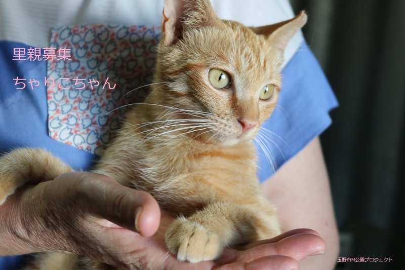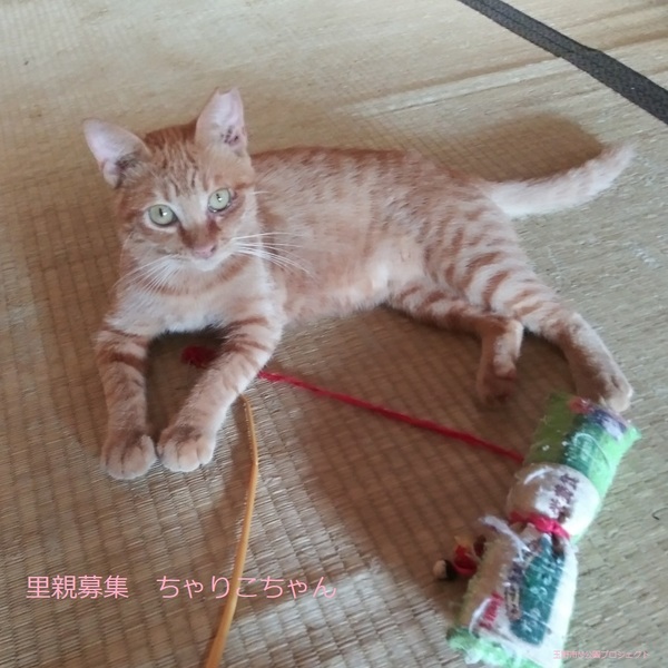 | 特徴(性格など) | 茶トラ子猫、女の子、仮名::ちゃりこちゃん 推定生後4~5ヵ月くらい、体重:2.5kg(8/4現在) 健康診断済み、ブラベクトプラス済み、 三種混合生ワクチン済み(7/25) 不妊手術済み(7/25) 血液検査-エイズ+陽性、白血病-陰性(8/4) トイレしつけ済み、 茶トラの女の子です。小柄で可愛らしい甘えん坊です。 FIV+ですが現在健康に問題ありません。通常の生活ではまずうつることはありませんが、ちゃりこちゃん一匹で飼われるようお願いします。 |