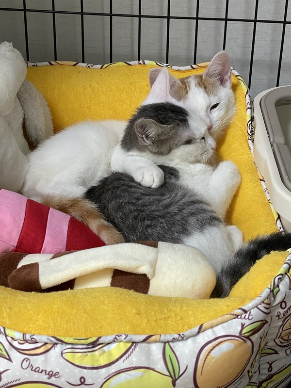 | 特徴(性格など) | 茶色×白 性格 ・臆病 ・兄弟を守る ・おもちゃで遊ぶのが大好き ・好奇心旺盛 ・慣れるとすごく甘える 検便、ウイルス検査、ノミ駆除済 現在前足両方の親指を怪我しているため治療中 |