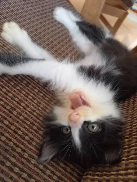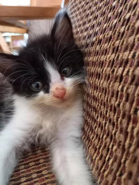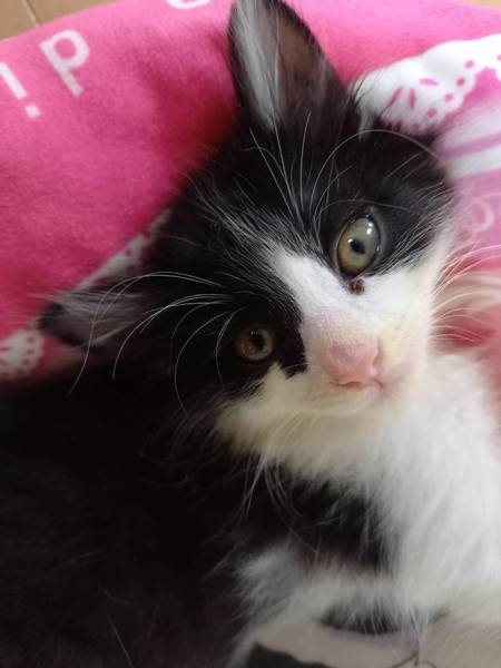 | 特徴(性格など) | モフモフな長毛のハチワレの男の子。 やんちゃな所もありますがとても甘えん坊さんです。ボランティアさんがミルクから育てので人慣れ抜群な子です。 |