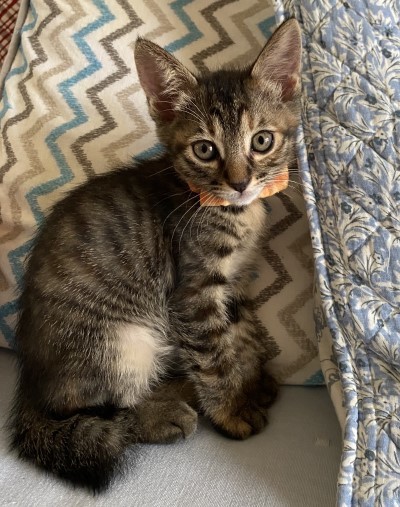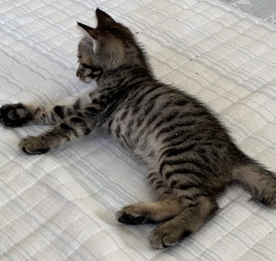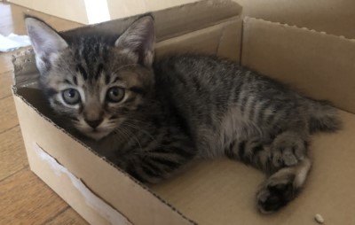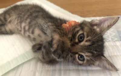 | 里親募集する理由 | 7月中旬の夕方のこと。「大雨の中、公園のバス停近くのところで4匹の子猫が鳴いていて、近くに親猫は見当たらないし、カラスがイッパイ狙っていてとても心配です!」と当協会に慌てた様子で電話して来てくれたのは、サッカー部の男子高校生でした。 急いで駆けつけてみると、まだ小さなキジの子猫3匹が体を寄せ合って震えており、少し離れたところにちょっと大きめの茶トラ1匹がいて、健気にも一生懸命カラスに対抗していました。興奮しているからか、保護しようとする人間にも激しく威嚇。頑張る長男坊でした。 すぐに保護して動物病院で診てもらったところ、生後1ヶ月くらいとのことで、雨の中お外にいたせいか、耳の中に泥が溜まっていたものの全員健康状態は良好で、ミルクとふやかしたカリカリをパクパクとよく食べました。 その時には僅か280gしかなかった一番小さな妹ちゃんも、懸命に威嚇していた頼れるお兄ちゃんもすっかり慣れて、毎日みんなで仲良く元気イッパイに遊んでいます。今では体重差も無くなりました。 現在生後1ヶ月半くらいで、離乳は完了しており、カリカリも食べられるようになって来ました。 この子たちを終生かわいがってくださる里親さんを募集中。 お兄ちゃん2匹には既に応募がありましたが、キジの女の子2匹は募集しています。 |