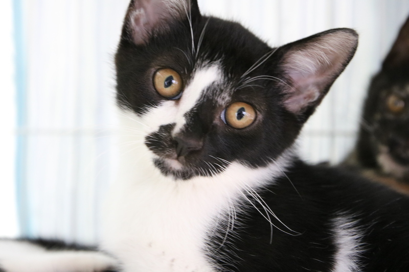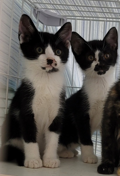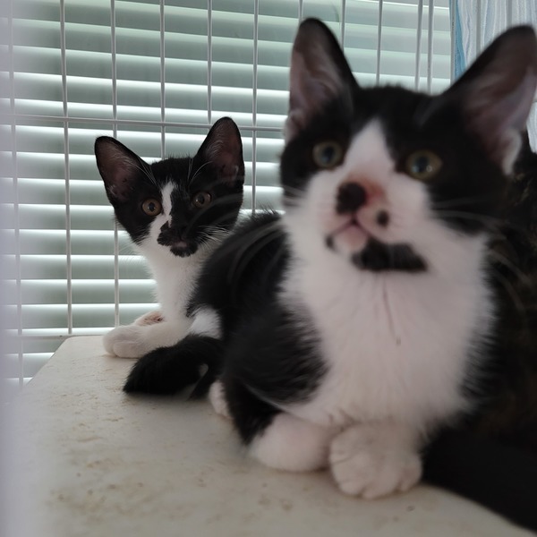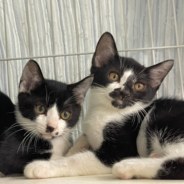 | 特徴(性格など) | とても仲良し、白黒仔猫2兄弟です。 八割れの子は、元気で、びっくりしたような丸い目がとてもチャーミングです。 黒い顔の子は、とても優しくておっとりしていて、ほっこりタイプです。 とても仲良しなので、2匹一緒に飼える方を希望します。 カーディガンを羽織ったような模様が、個性的です。 ◆健康状態 のみ・ダニ駆除済(リボリューション) 駆虫済 保護した頃、クシャミと鼻水の風邪をひいていましたが、病院でもらった薬を飲用し、完治しています。 よく食べて元気です。 オモチャでも遊ぶようになりました。 人馴れもして来たので、無邪気で可愛らしい間に、早く狭いゲージから出してあげ、のびのびと過ごせる里親さんが見つかるように祈っています。 |