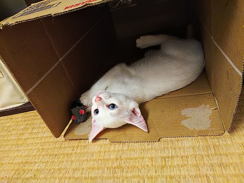 | 特徴(性格など) | 白猫、青い目、鉤尻尾、とても人なつっこく、良くあそびます。 トイレは所定の場所で出来ます。 |