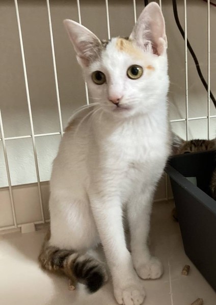 | 特徴(性格など) | シャイガールですが、甘えたさんです。 食いしん坊で食欲旺盛です。 しっぽと顔(ハチワレ)に三毛模様があります。 体は綺麗な白色です。 和風美人さんです。 |