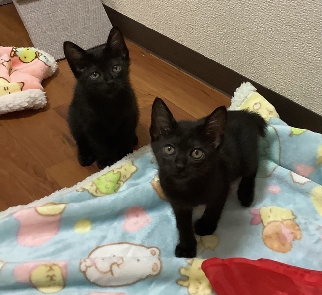 | 特徴(性格など) | 黒猫の女の子です。尻尾は短いです。人にも慣れてきました。一番のおチビさんで小さくてお顔も可愛いです。 | ||