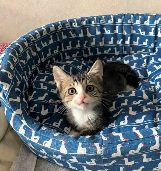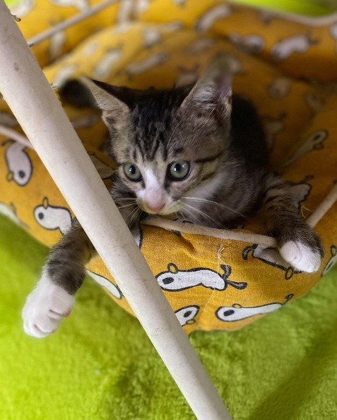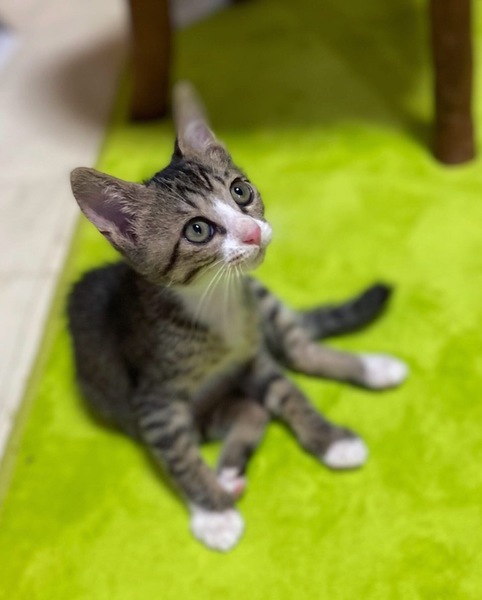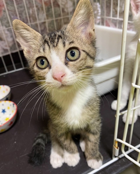 | 特徴(性格など) | 細かいシマシマ模様×白 きじ白男の子・しっぽの先がちょっとだけくるりとしています。 場所見知り人見知りなしの、大らかさん。 撫でれば直ぐにゴロゴロ~膝の上に飛び込んで来る甘えん坊さんです。 眠たい時、仰向けに持ち上げると~ダリンダリンに力を抜いたままゴロゴロ~ とても可愛い子です。 |