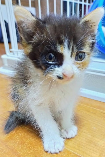 | 特徴(性格など) | 黒白茶色のぶち模様です。耳上が茶色、足が白い所がチャームポイントです。 目が大きく手足の長い美人です。 臆病な感じがしておとなしくだまっている事が多いです。でも人の目をじっと見つめるとっても可愛い子です。 |